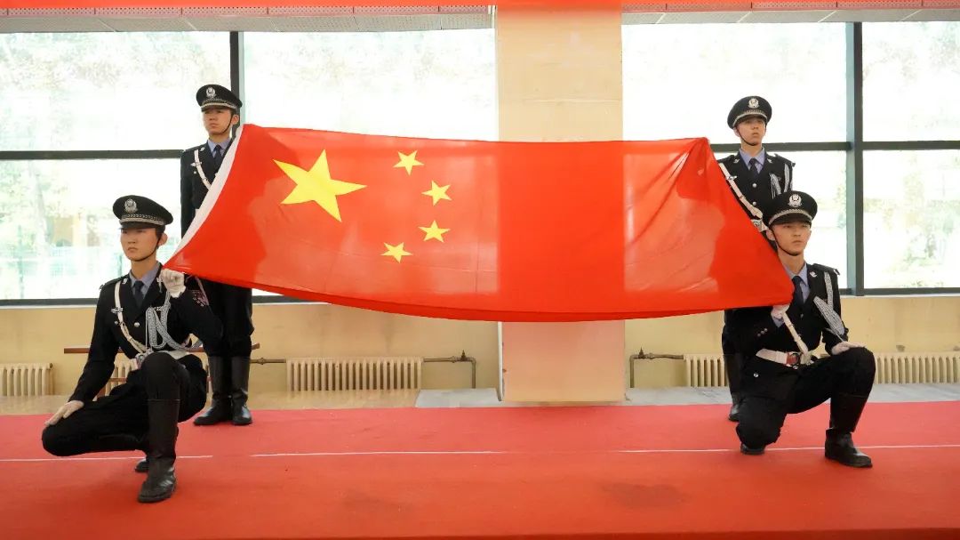 国旗护卫队展开国旗,庄严的国歌声缓缓响起,全体师生奏唱国歌。