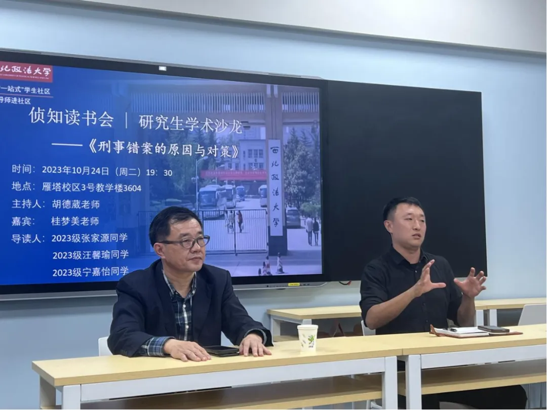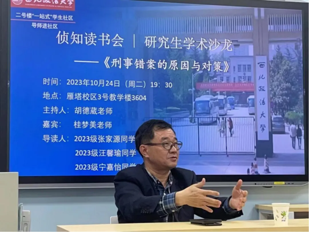 为推动“一站式”学生社区建设,落实导师进社区制度,加强同研究生的交流,营造活跃的学术研究氛围,10月24日晚,日本av 于雁塔校区3号楼604教室举行研究生学术沙龙——《刑事错案的原因与对策》。日本av 副院长、副教授、法学博士、硕士生导师桂梦美担任分享嘉宾。本次读书会由侦查学教研室主任胡德葳主持,2023级张家源、汪馨瑜、宁嘉怡同学进行导读分享。