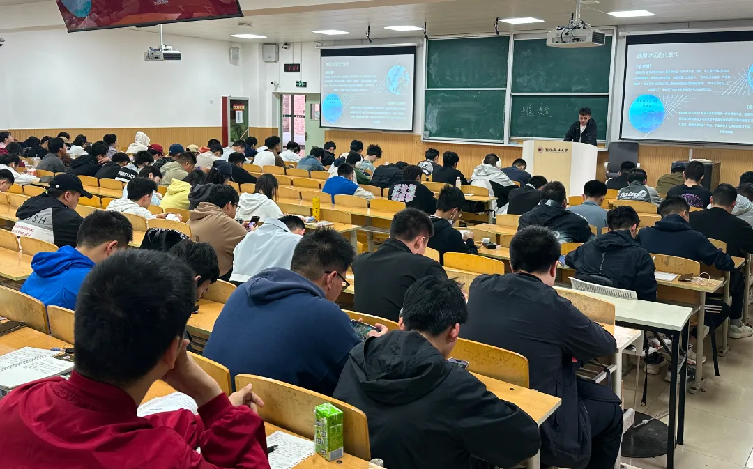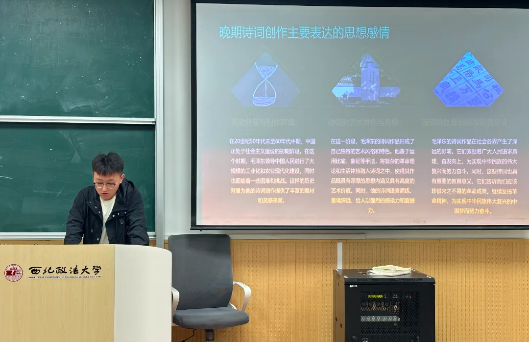 王浩宇以时间为线索,向同学们展示了毛泽东诗词在早、中、晚三个时期不同的写作风格与思想感情,带领学生从诗词中感悟毛主席英勇斗争的革命精神和不怕牺牲的家国情怀。