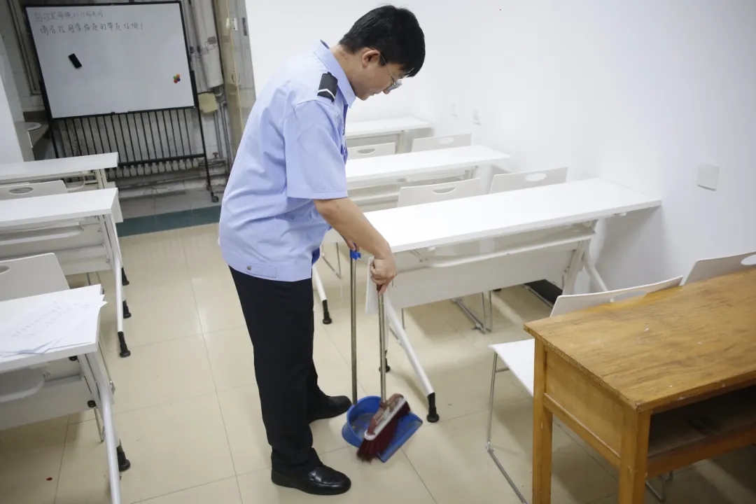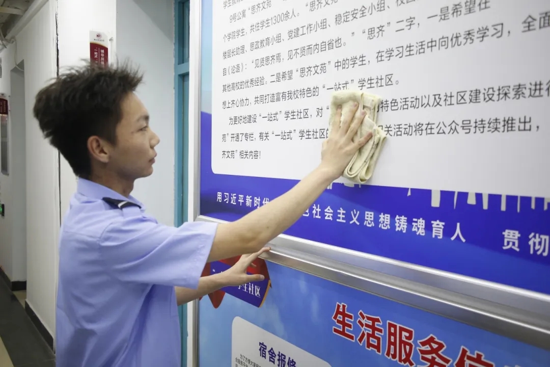 在“思齐文苑”学生自习室里,志愿者们分工明确,积极打扫每日勤学的一方天地,室外春光明媚,室内窗明几净,为学生打造了静谧,温馨的学习氛围。