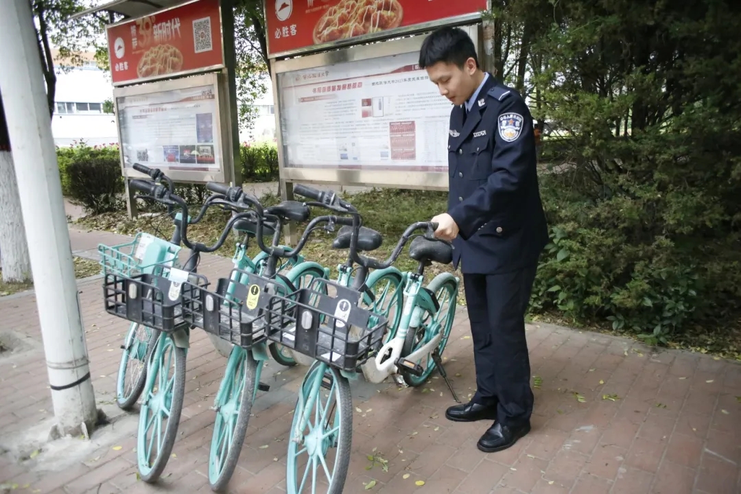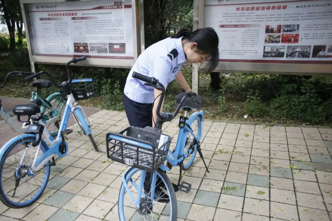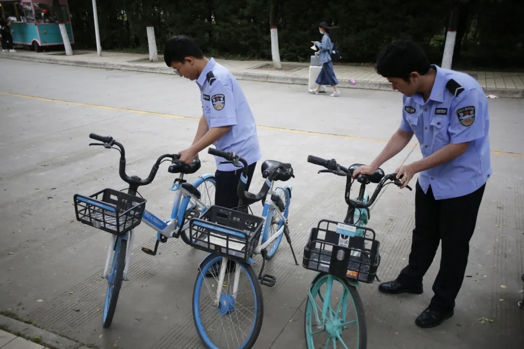 在道路两旁,整理共享单车的志愿者成为人群中的焦点,他们将自行车安置规整,井然有序,使其成为校园中的一道风景。