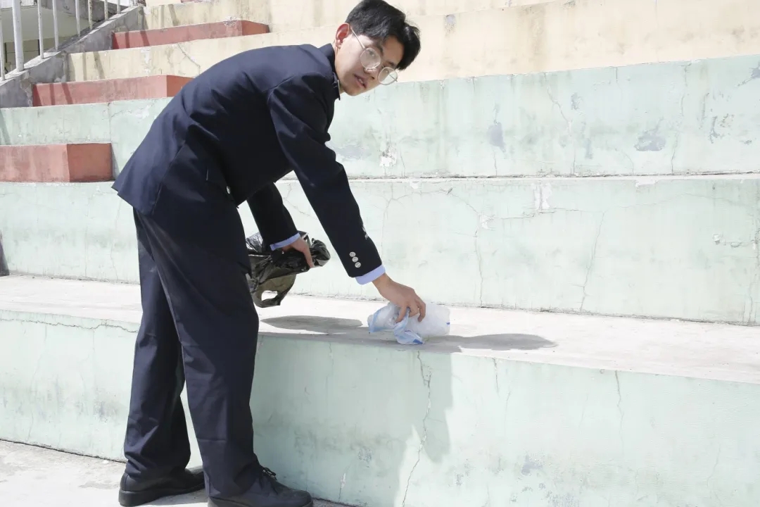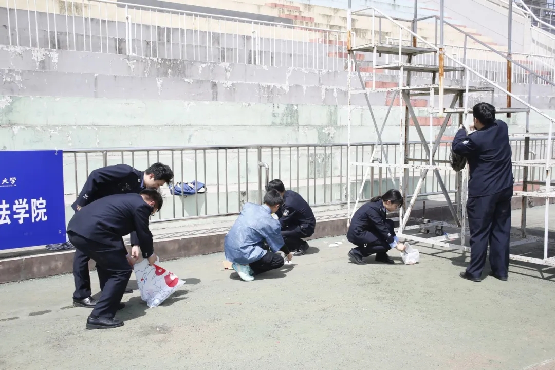在运动会会场上,公安志愿者发扬“不怕脏、不怕累”的劳动精神,认真清理操场看台上的每一处角落,不落下任何死角,充分展示了“团结、友爱、奉献、进步”的志愿服务精神。