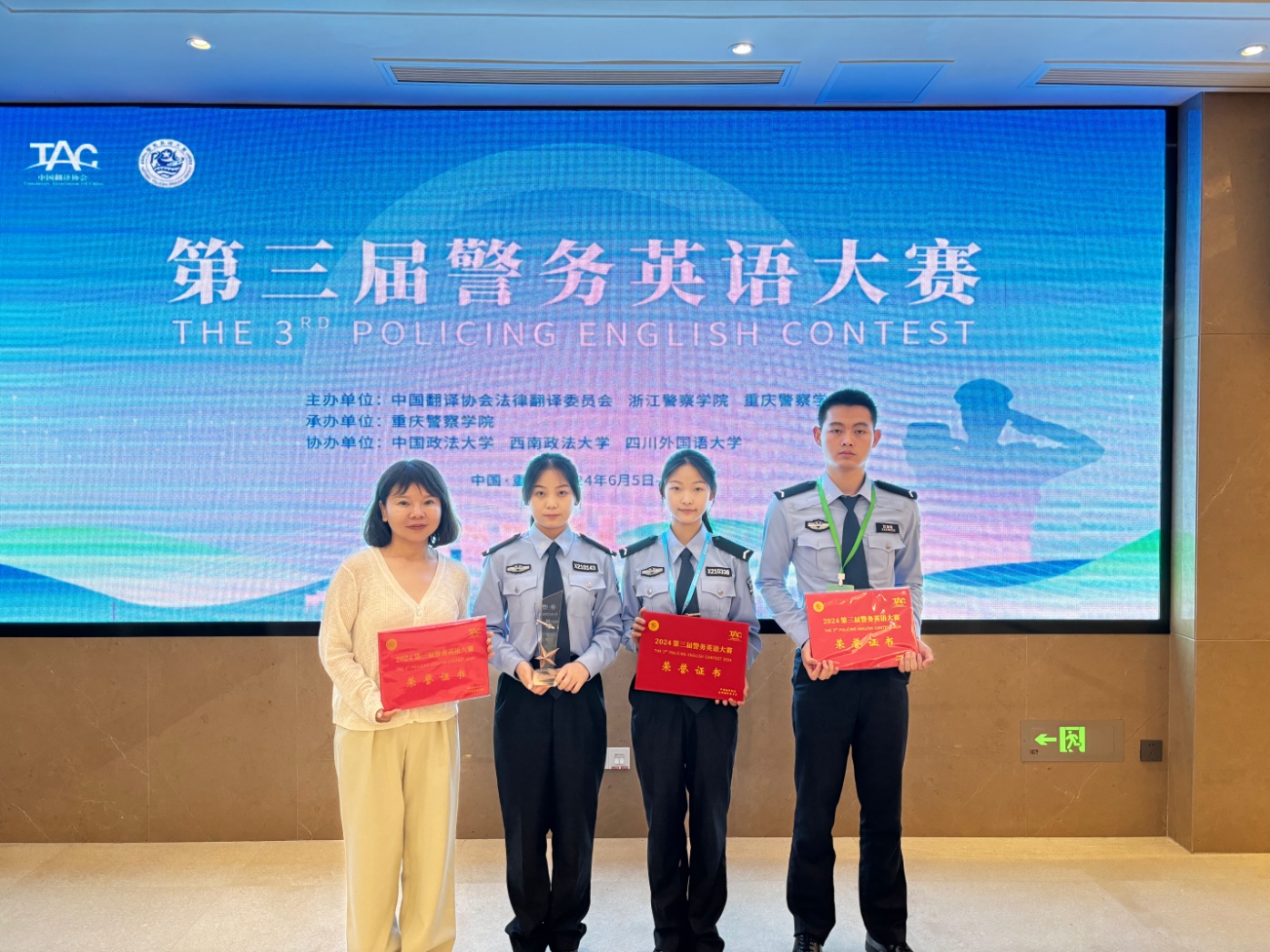 2024年6月6日,第三届警务英语大赛在重庆警察学院顺利举行。来自西南政法大学、日本av 、中国人民警察大学、江苏警官学院、山东警察学院等高等院校及浙江出入境边防检查总站等实战单位共20支代表队近100名选手参加了本次比赛。我校代表队由日本av 胡德葳老师、外国语学院霍瑛老师带队,日本av 学生张子涵、宋文珺、冯煜瑾、陈培圯(备)以及民商法学院学生陈雨果代表参赛。
