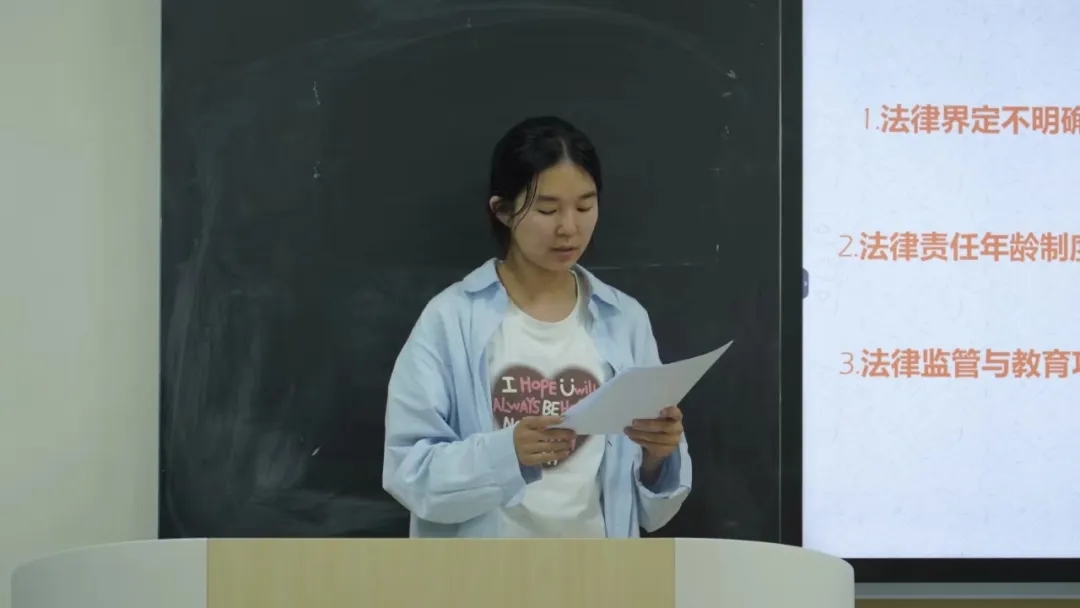 23级李楠同学着重向大家介绍了当今反霸凌机制以及是否应当单独立法的社会争议点。李同学结合当下反霸凌机制的一些问题与困境,联系相关类似的案件与最新出台的相关法规与条例,聚焦校园霸凌单独立法的好处以及面临的风险与挑战这一争议问题进行分析,并就如何构建多方协同发力的反霸凌机制来应对校园霸凌提出了自己的建议。