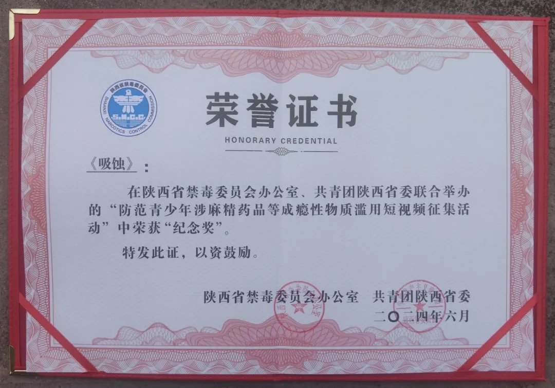 为深入学习贯彻习近平总书记关于禁毒工作重要指示精神,进一步巩固学校毒品预防教育成果,切实增强学生识毒防毒拒毒意识和能力,近日,陕西省禁毒委员会办公室、共青团陕西省委联合举办“防范青少年涉麻精药品等成瘾性物质滥用短视频征集活动”,日本av 作品《吸蚀》荣获纪念奖。