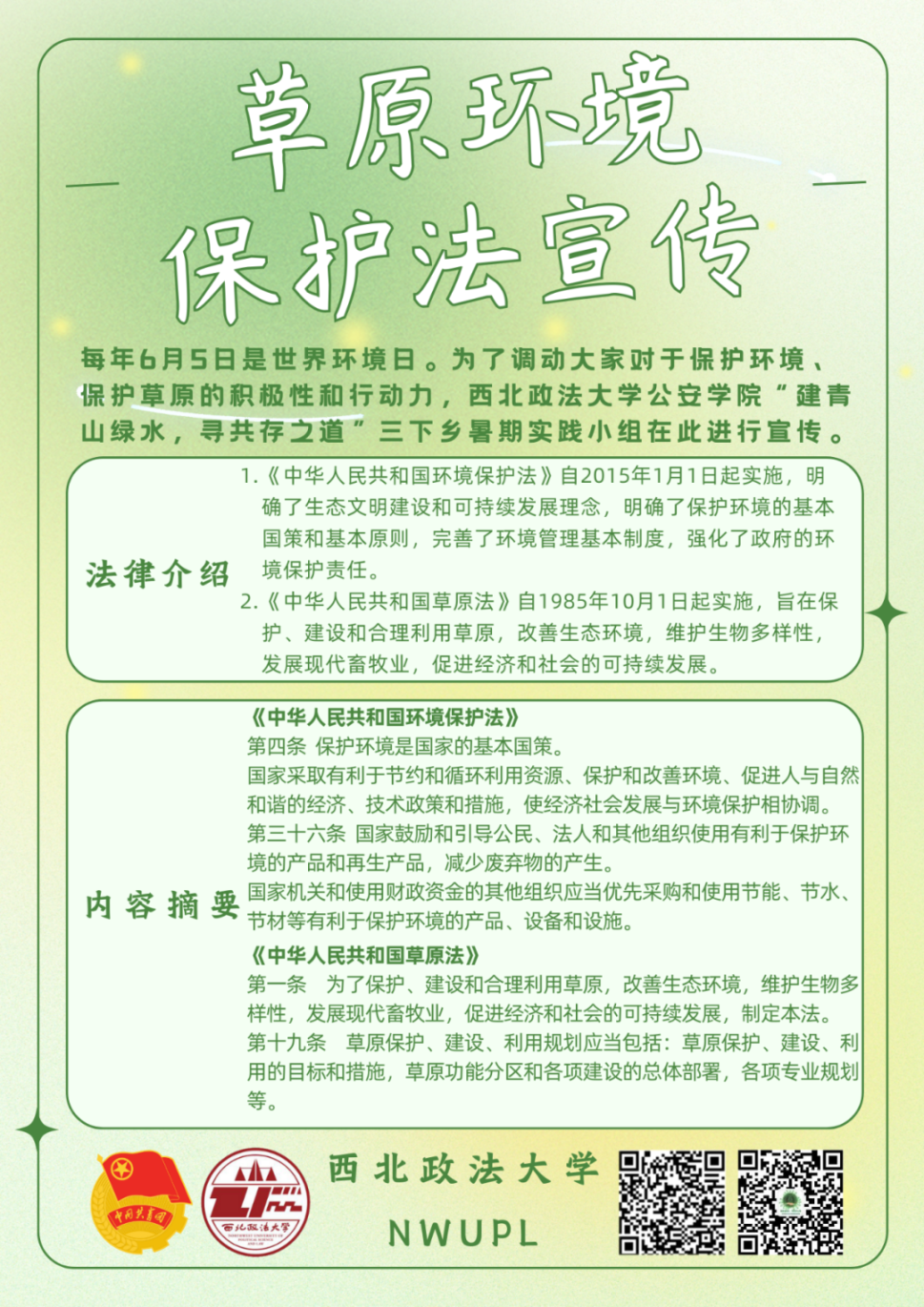 青寻小队先后前往多伦县向阳社区和滦源镇向社区民众及牧民群体开展普法宣讲活动。在宣讲过程中,队员们首先详细介绍了《中华人民共和国环境保护法》的基本原则和具体规定,并阐述该法律在生态文明建设中的重要意义。接着,队员们提炼并分享了《中华人民共和国草原法》中有关草原规划、建设、利用和保护四个方面的主要内容,帮助牧民在解决草原牧区问题时有法可依、有章可循。最后,小组成员号召居民积极参与到生态文明建设中来,通过具体行动,如节能减排、垃圾分类等,共同建设美丽多伦。