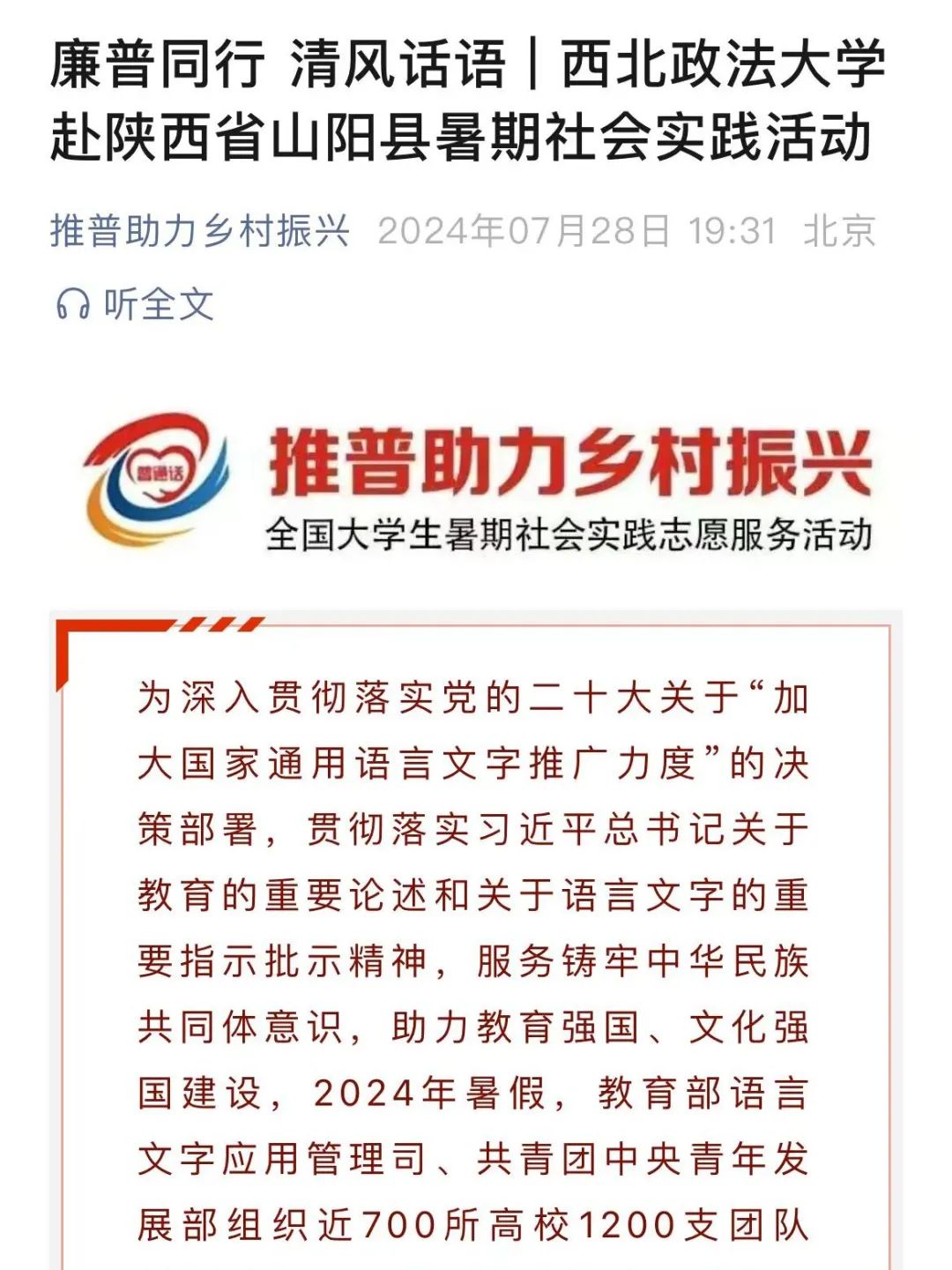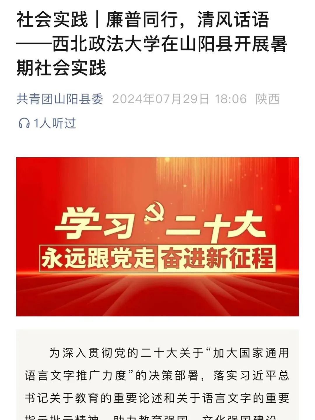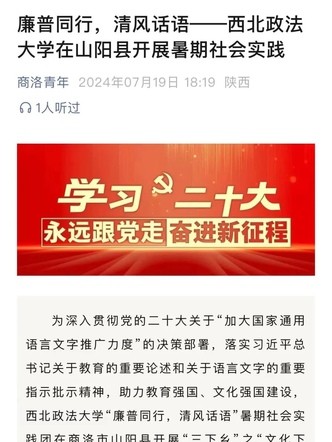 日本av “廉普同行,清风话语”实践队在商洛市山阳县开展“三下乡”之“文化下乡”社会实践活动,积极参与“推普助力乡村振兴”社会实践志愿服务活动。日本av 校纪委综合室秘书王恩、校团委社团文体部部长张革、日本av 团委书记方宁、外国语学院王莎莎指导实践活动开展。本次活动受到中国网、商洛青年、推普助力乡村振兴、共青团山阳县委等多家媒体的关注和报道。
