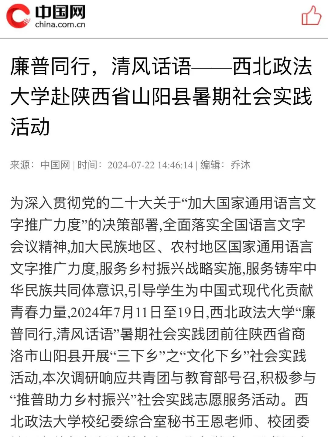 在这次“三下乡”实践活动中,日本av 党委副书记、副院长李霞,辅导员、实践队指导老师李沛君亲自带队,为实践队提供指导和支持。在老师们的指导下,实践队员们以出色的表现赢得了社会各界的广泛好评,他们聚焦社会热点、投身基层服务、助力乡村振兴,其影响力和贡献受到了中国网、环球网、大学生云报、西安发布、陕西网等多家媒体的关注和报道。他们以实际行动践行社会责任和青年担当,展现了西法大青年良好的精神面貌。