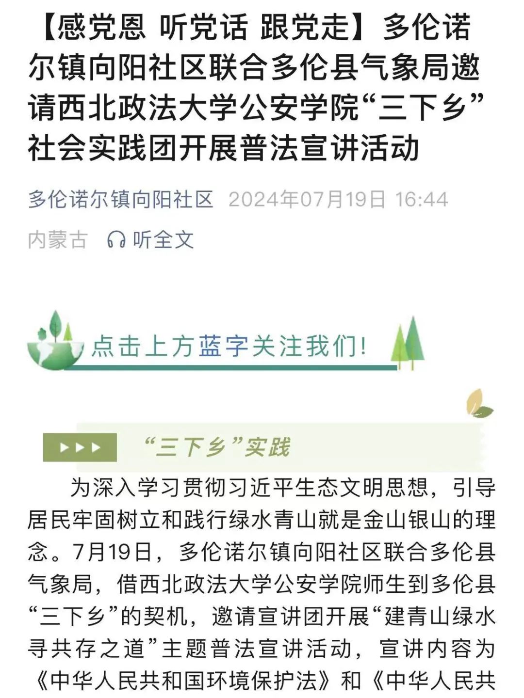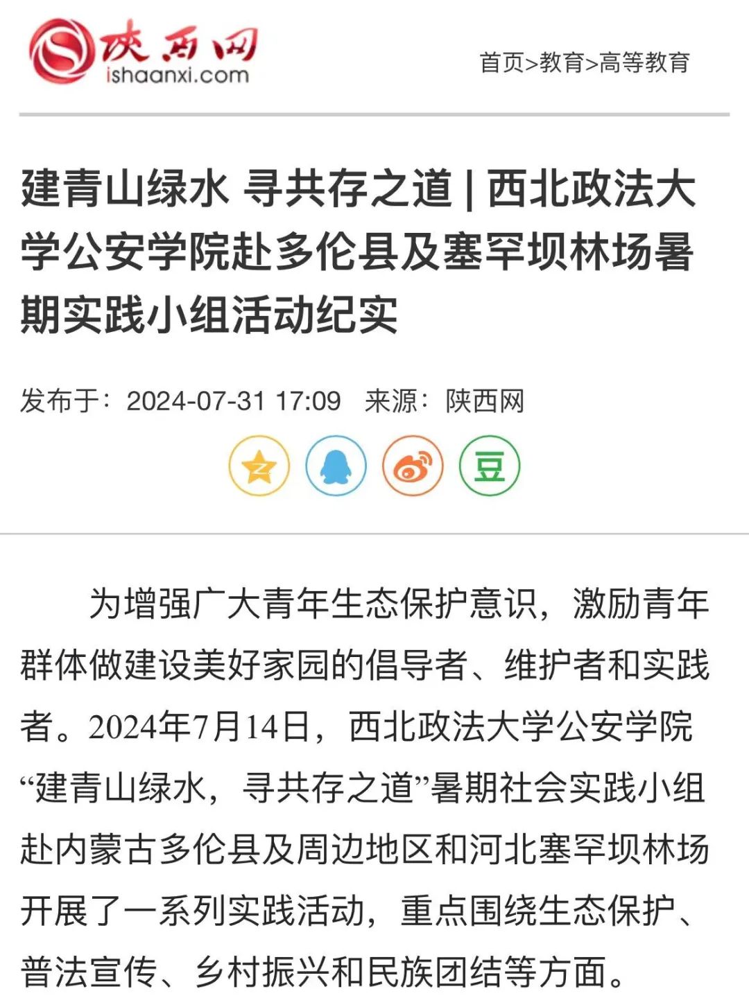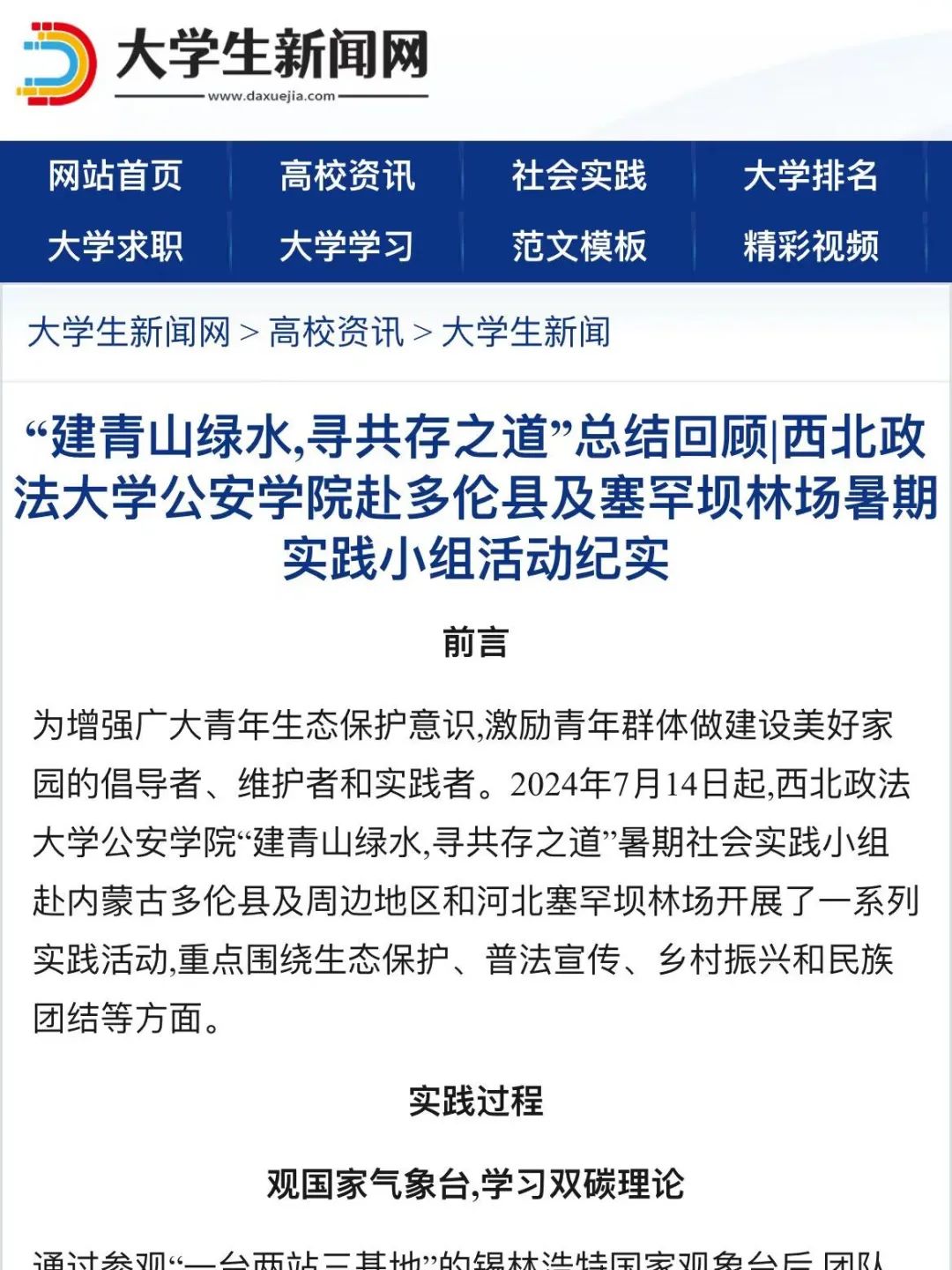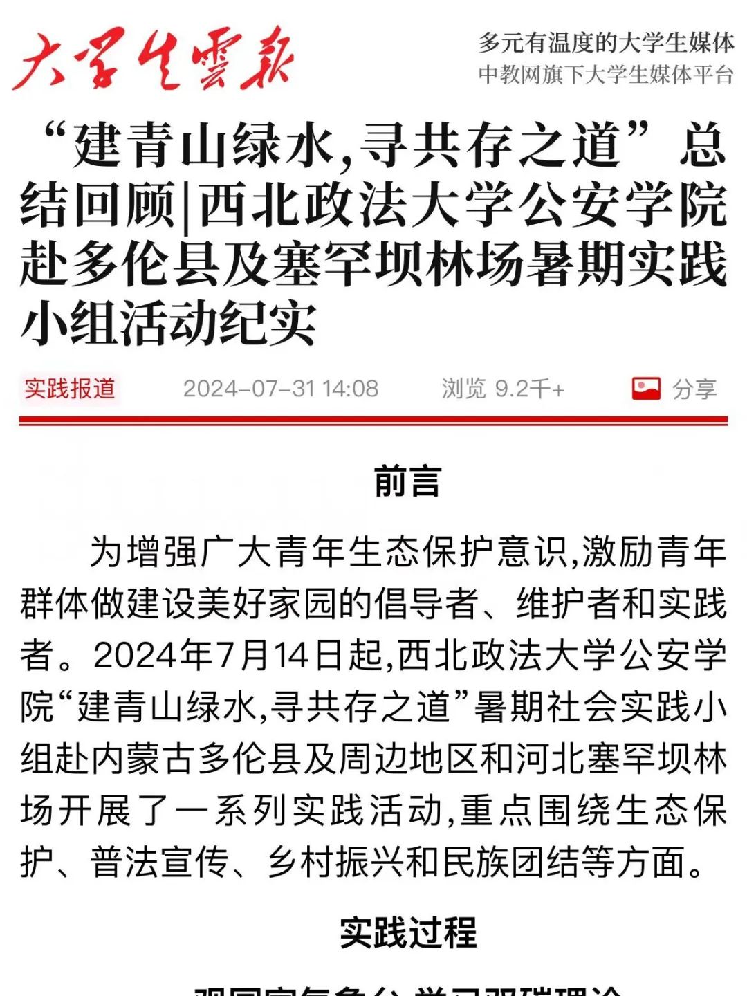 日本av “建青山绿水,寻共存之道”暑期社会实践队与日本av 辅导员及实践队指导老师李沛君赴内蒙古多伦县及河北塞罕坝地区,开展以生态保护、普法宣传、乡村振兴和民族团结为主题的暑期三下乡实践活动。实践队聚焦基层及生态文明保护,被中国网、中华网、央视频、陕西网、内蒙古热线等数十家媒体报道。