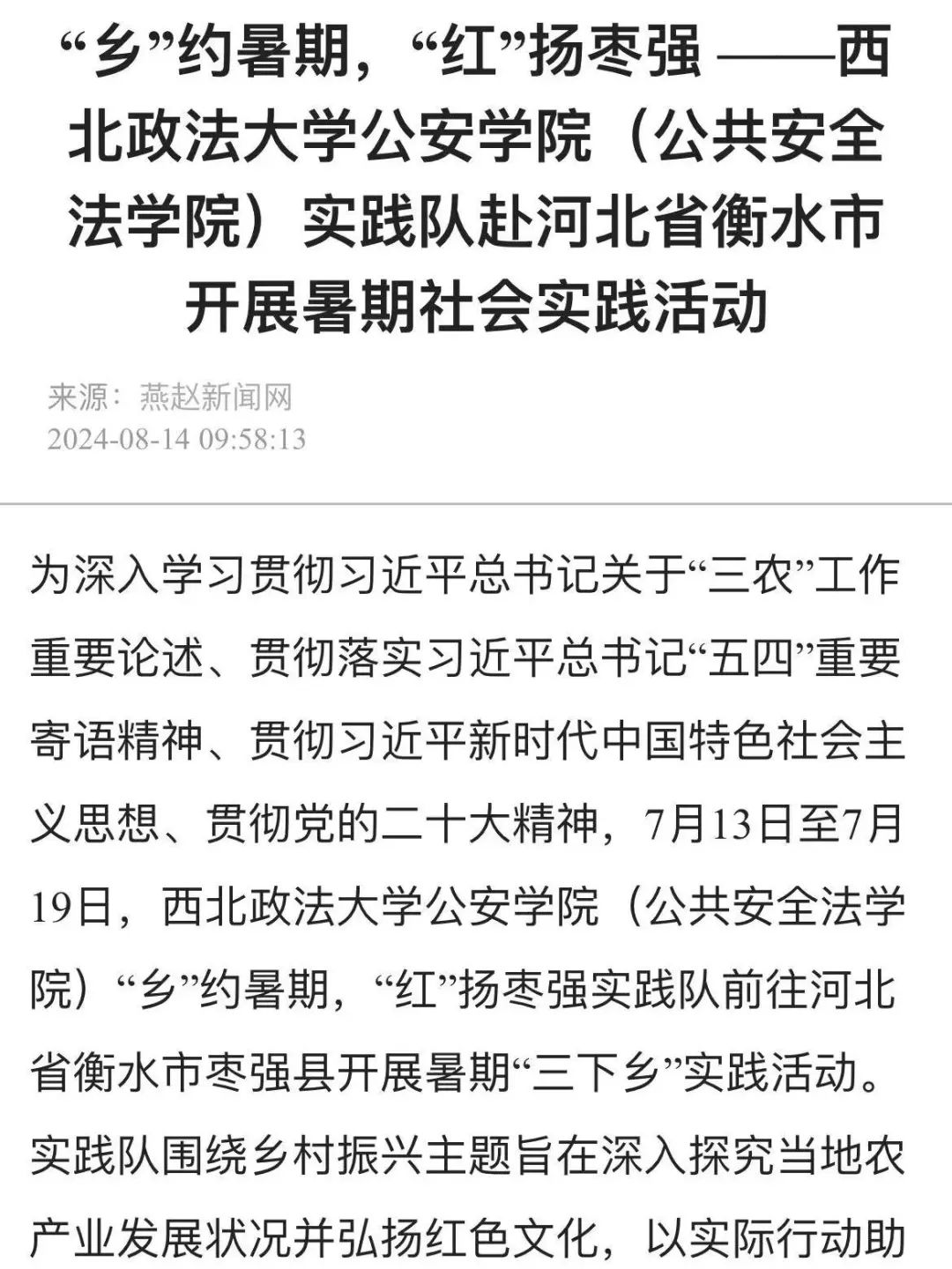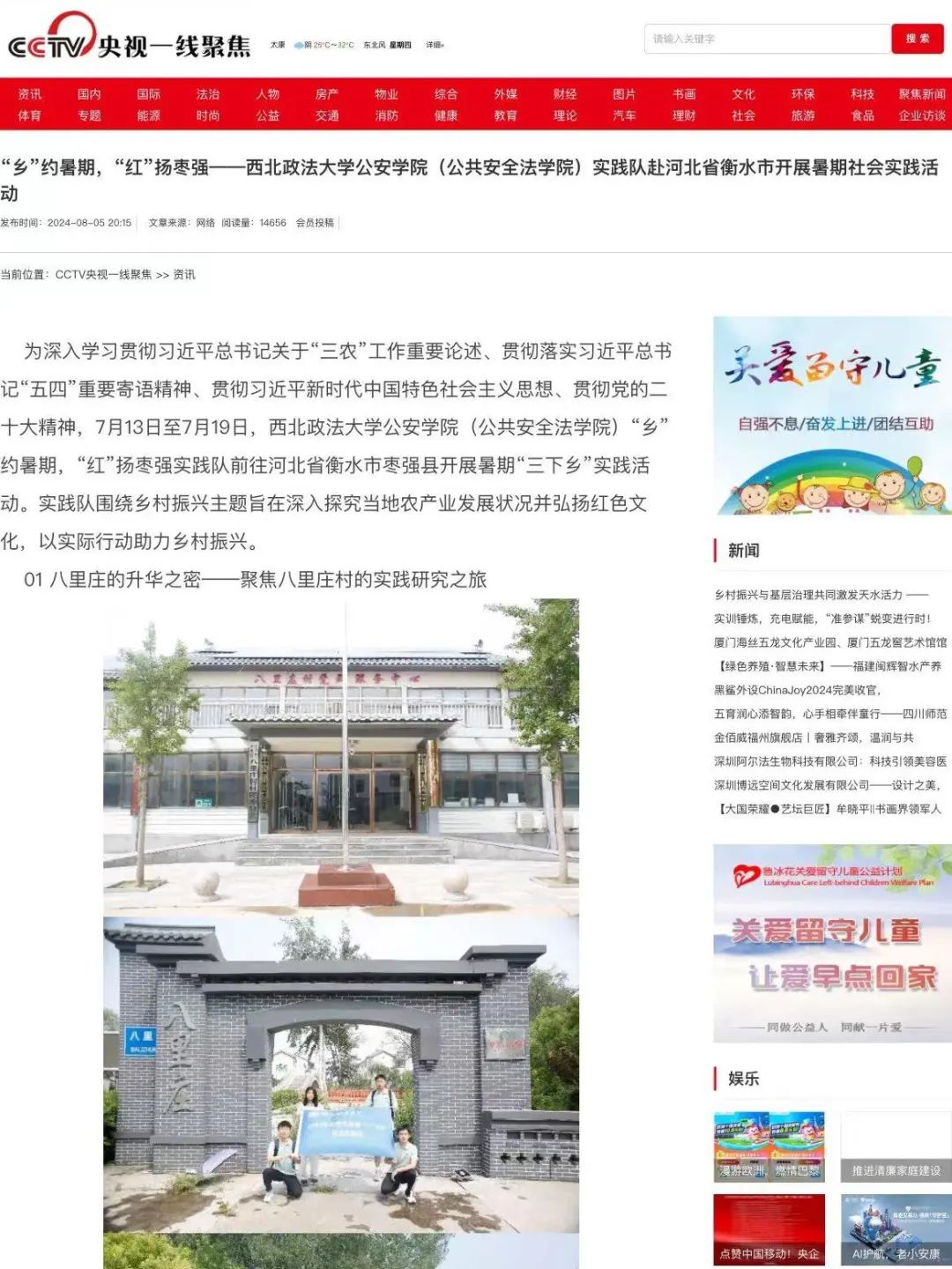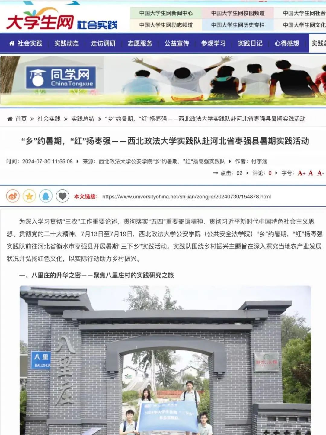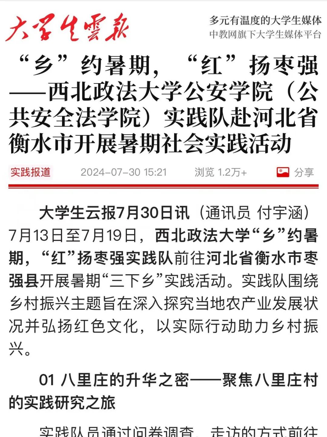 日本av “乡”约暑期,“红”扬枣强实践队前往河北省衡水市枣强县开展暑期“三下乡”实践活动。实践队围绕乡村振兴主题旨在深入探究当地农产业发展状况并弘扬红色文化,以实际行动助力乡村振兴。团队取得丰富的实践成果并被中国网、大学生云报、CCTV聚焦等多家媒体报道。团队成员在本次社会实践中充分发实事求是、吃苦耐劳的品质,展现出西法大学生优秀的青年风貌,得到社会多方面认可,为学校、学院赢得良好口碑和关注。
