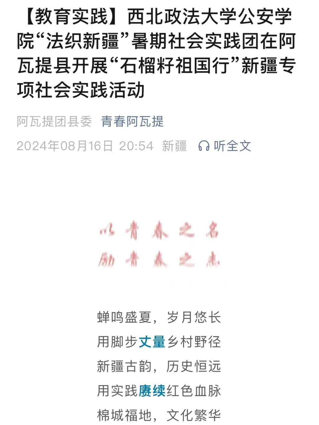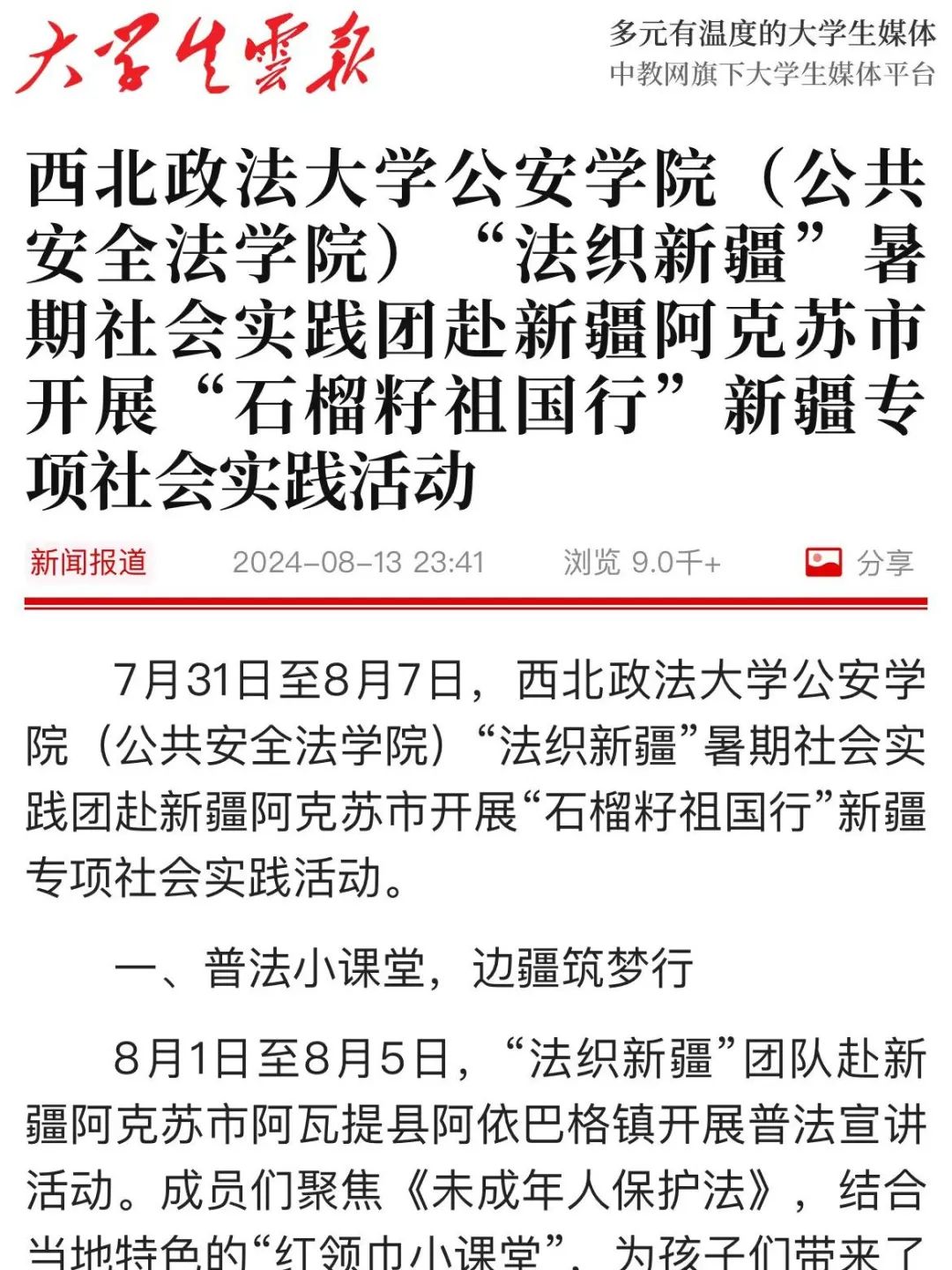 日本av “法织新疆”暑期社会实践团赴新疆阿克苏市开展“石榴籽祖国行”新疆专项社会实践活动。本次实践活动的显著成效赢得了当地政府和居民的普遍赞誉和高度评价,其实践成果被大学生云报、青春阿瓦提、阿瓦提县融.阿依巴格镇站等多家媒体报道,展现了西法大青年良好的精神风貌,为学校、学院赢得口碑和关注。