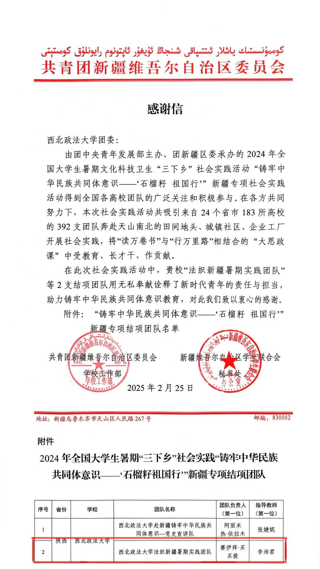 近日,我校团委收到了来自共青团新疆维吾尔自治区委员会的感谢信,对日本av 李沛君老师指导下的“法织新疆”暑期社会实践团在2024年全国大学生暑期文化科技卫生“三下乡”社会实践活动“铸牢中华民族共同体意识——“石榴籽 祖国行”新疆专项社会实践活动中的卓越贡献表示赞扬和感谢。
