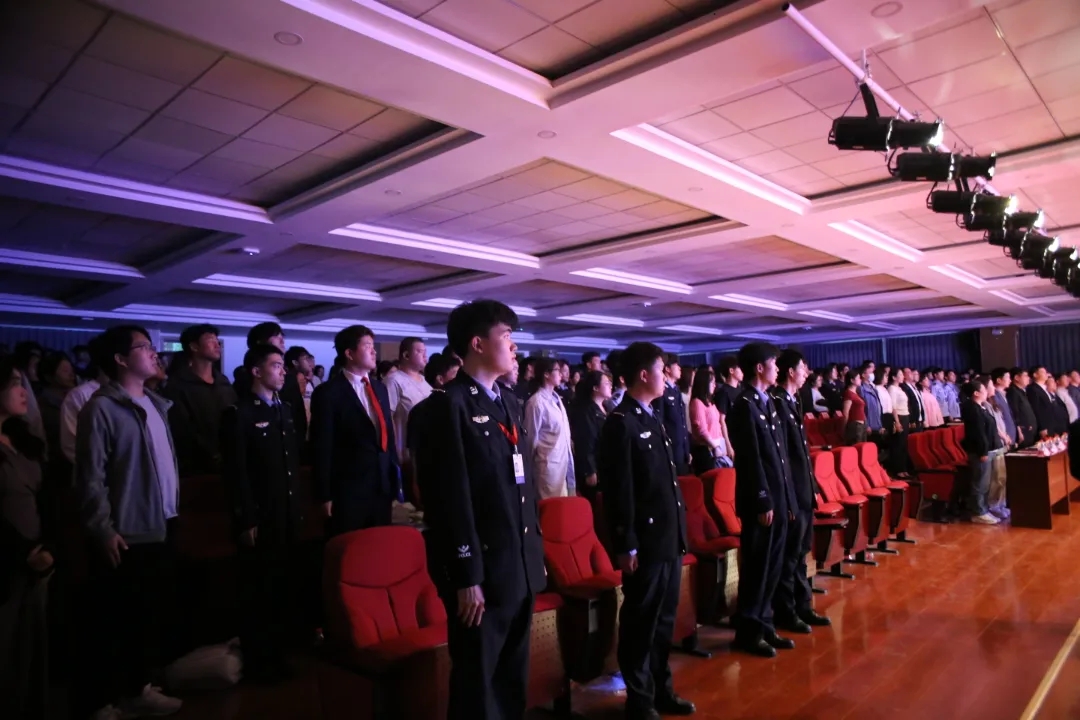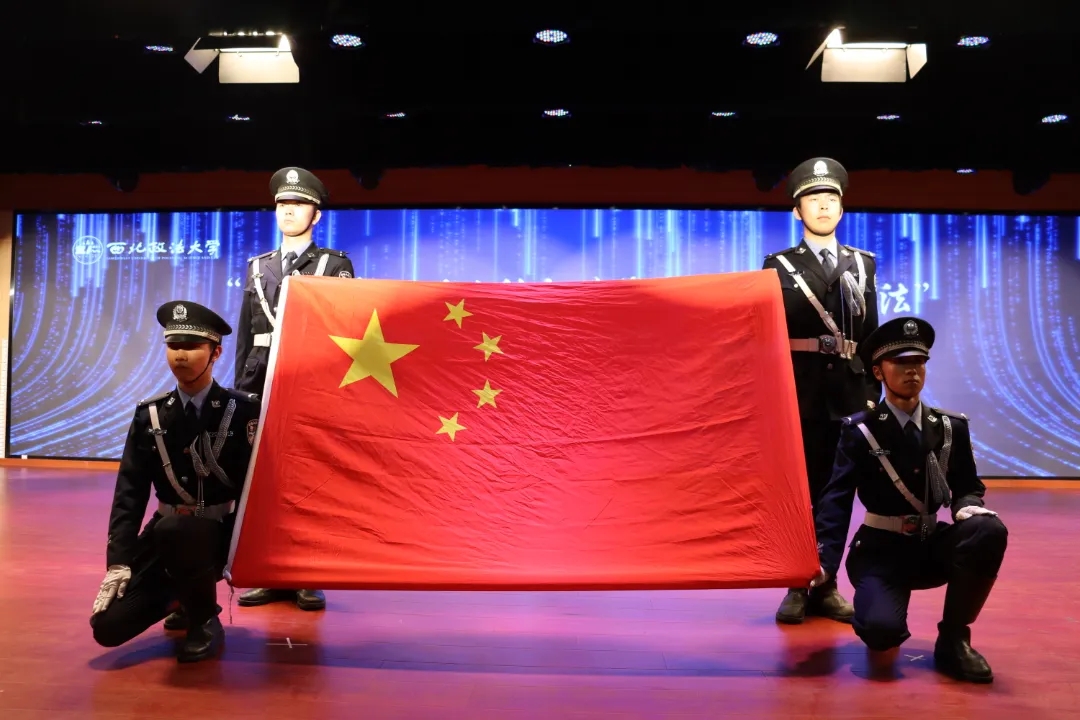 伴随慷慨激昂的国歌,国护队员缓缓展开国旗;全场师生肃立注目,共同奏唱国歌,“探案说法”法律案例研习大赛决赛正式拉开帷幕。