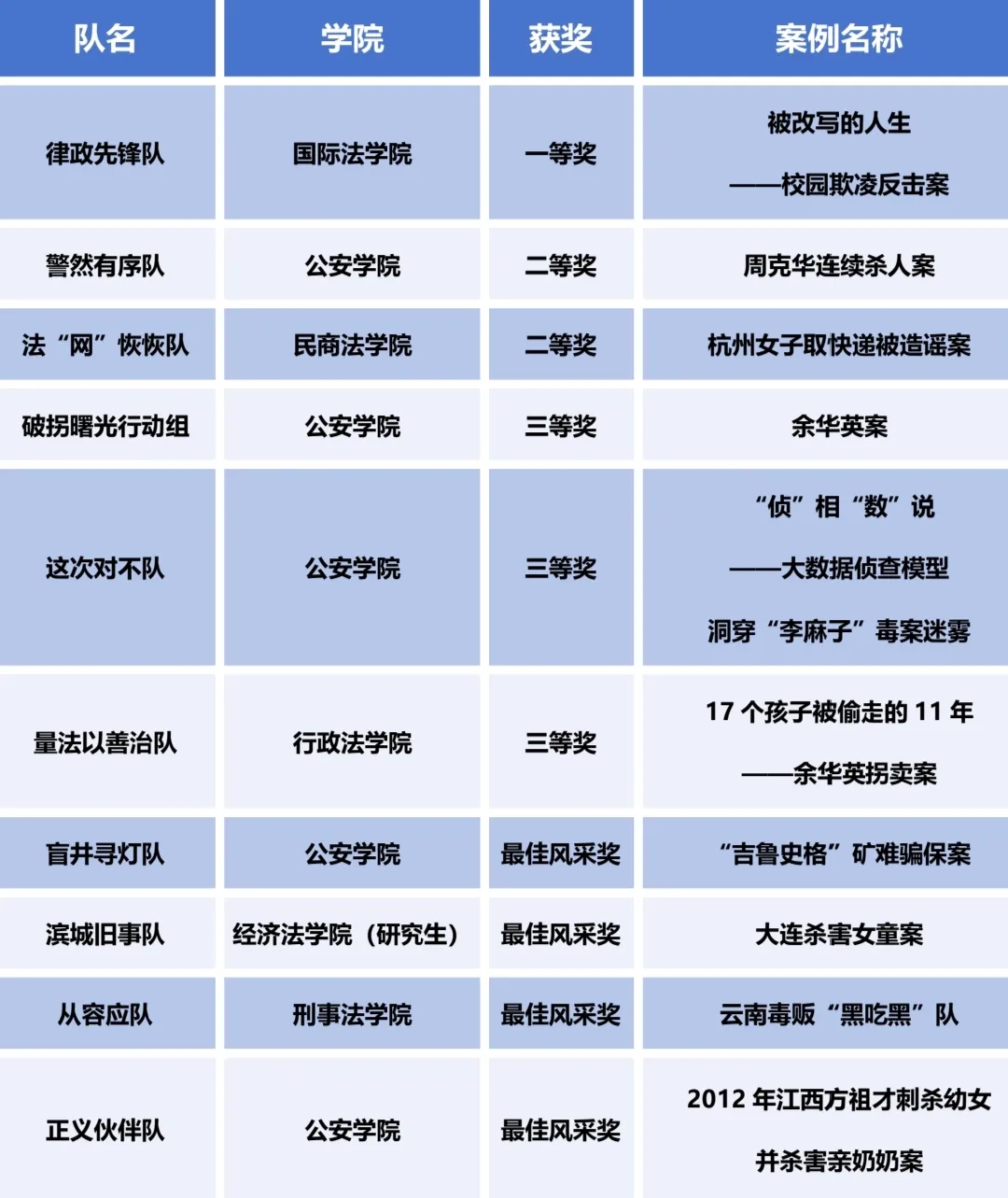 经过紧张赛程和激烈角逐,律政先锋队获一等奖;警然有序队、法网恢恢队获二等奖;破拐曙光行动组队、这次对不队、量法以善治队获三等奖;盲井寻灯队、滨城旧事队、从容应队、正义伙伴队获最佳风采奖。10支参赛队伍凭借过硬的理论素养、灵活的实践能力、稳健的仪表台风,彰显了青年朝气蓬勃的精神面貌和昂扬向上的道德风尚,呼应“以赛促学”活动主题,为深入贯彻落实国家法治建设要求贡献青春力量。