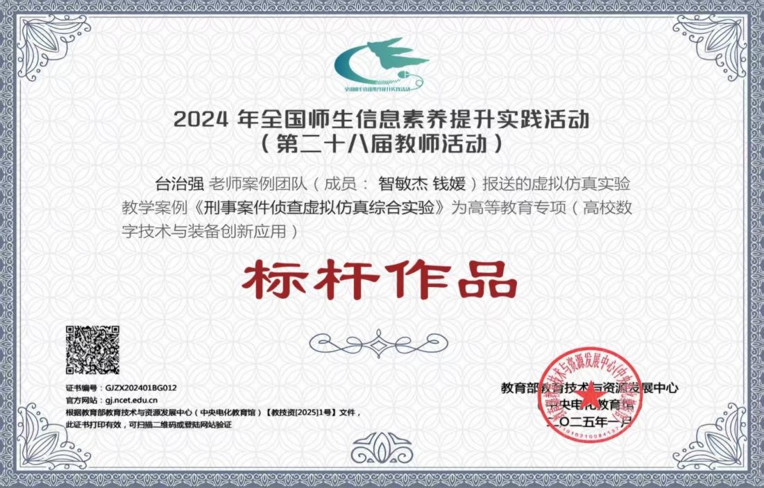 2025 年 4 月 17 日至 18 日,教育部教育技术与资源发展中心(中央电化教育馆)主办的全国师生信息素养提升实践活动(第二十八届教师活动)高等教育专项现场交流活动在广州举行。由我校申报的《刑事案件侦查虚拟仿真综合实验》获高等教育专项高校虚拟仿真实验教学案例的标杆作品,并在大会进行展板展示和发言交流。这是我校《刑事案件侦查虚拟仿真实验》教学软件继2016年获全国高等学校虚拟仿真实验教学资源成果二等奖、2021年获全国高校教师教学创新大赛---第六届全国高等学校教师自制实验教学仪器设备创新大赛二等奖、2023年获陕西高等学校科学技术研究优秀成果奖三等奖、2023年被评为国家级虚拟仿真一流课程后又一次获得的全国性奖励。
