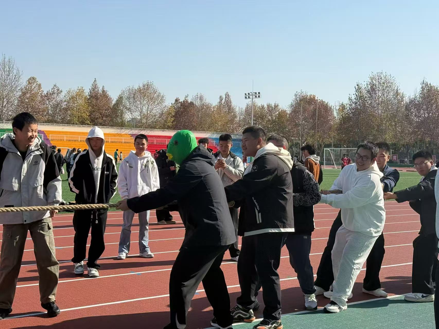 活动伊始,师生拔河比赛率先点燃全场热情。随着裁判口令响起,参赛师生迅速进入状态,双手如铁钳般紧握着麻绳,脚蹬实地、压低重心,身体后倾,每一次发力都伴随着整齐的呐喊;场边的同学和老师们“加油”的口号震彻云霄,助威声与绳索摩擦声交织成激昂的乐章。日里传道授业的老师与青春洋溢的学生并肩作战,力量在绳索间凝聚,默契在协作中滋生。当胜负已分时,获胜队伍相拥欢呼,失利方也笑着互相击掌,双方在输赢之外,更收获了跨越身份的深厚情谊。