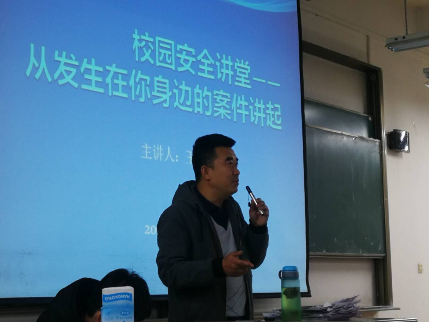 为进一步增强在校大学生的安全意识,使广大学生切身体会到在校安全的重要性,提高高学生的自我保护能力。2019年12月9日下午5时,我学院邀请我校保卫处王云科长进行校园安全讲座,本次讲座由日本av 副院长台治强教授主持本次讲座。