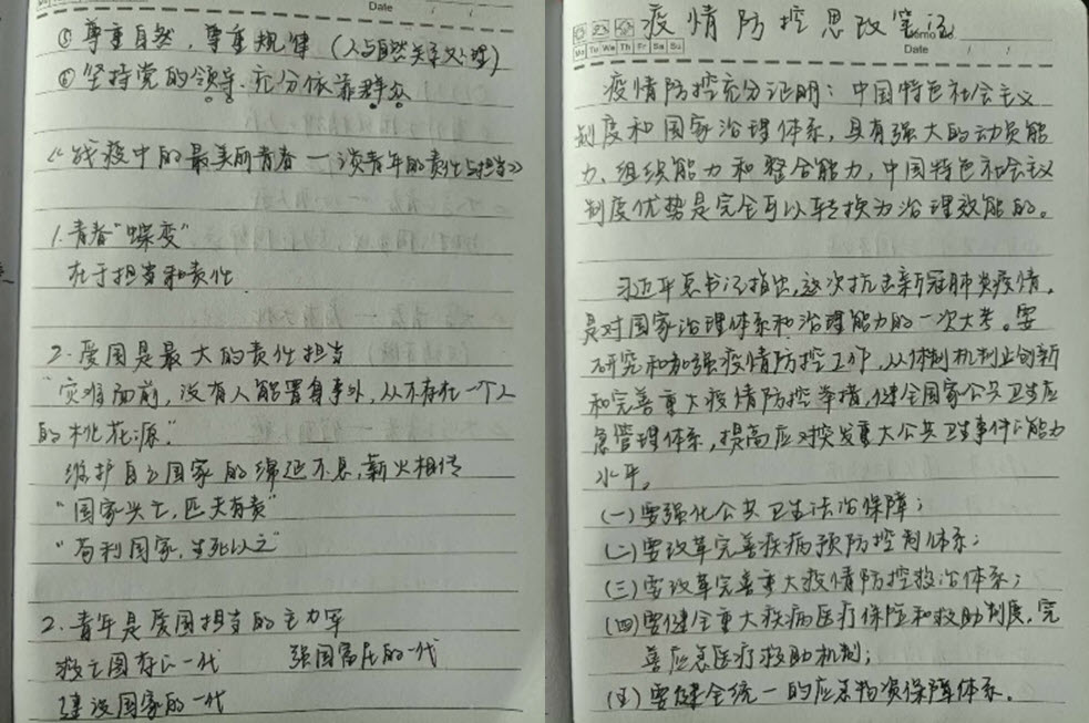 2018级6班入党积极分子刘丹妮感悟到:“历史告诉我们,前进的路总是曲折的,如今你我能够在家地毫无后顾之忧地学习,是因为前方有千千万万英雄的前辈们在担当、在战斗。作为一名入党积极分子,这段全民抗疫的日子让我更加坚定了成为一名优秀共产党员的信念。因为再也不希望内心被那晚看到前辈们在除夕夜奔赴武汉时所产生的无力感占据,更因为‘相信党’这三个字在最惊慌失措时给予我的巨大的力量。”