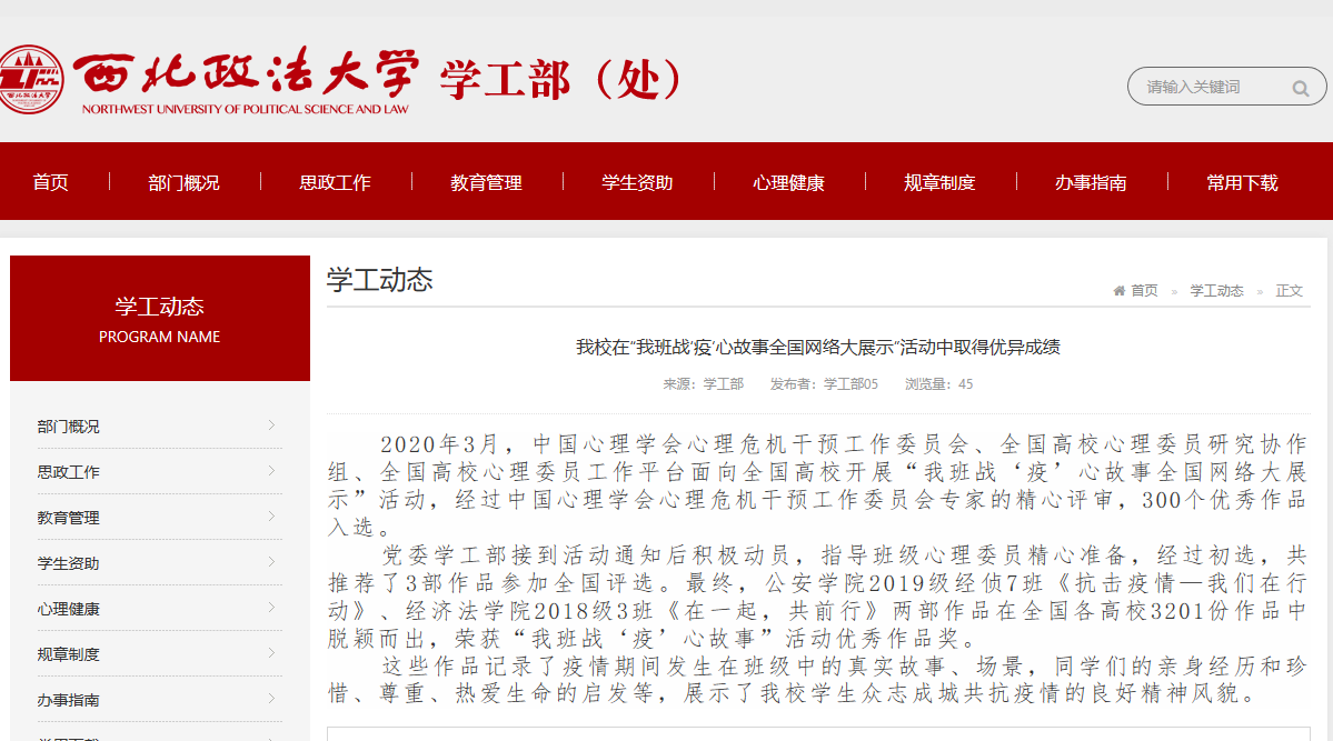 2020年3月,中国心理学会心理危机干预工作委员会、全国高校心理委员研究协作组、全国高校心理委员工作平台面向全国高校开展“我班战‘疫’心故事全国网络大展示”活动,经过中国心理学会心理危机干预工作委员会专家的精心评审,300个优秀作品入选,我校共有两部作品获奖。