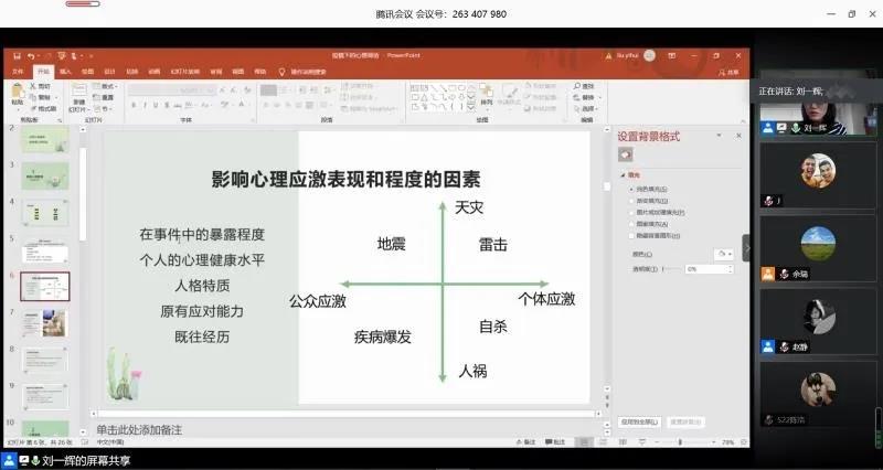 首先,刘一辉老师以“后疫情时期的心理调适”为主题,详细的讲述了心理应激表现对大学生的身心健康的影响,介绍了在疫情常态化的背景下,大学生进行心理调适的技巧和方法。随后,刘老师结合疫情时期的具体事例,为大家介绍了在面对各种压力时如何进行情绪表达和情绪宣泄,并建议大家通过倾诉、运动等方式积极调节心理问题,促进情绪稳定。在讲座上,同学们积极同刘老师互动,向刘老师提出自己所遇到的问题,刘老师耐心地为同学们一一解答,并针对不同的问题提出了相应的解决方案。