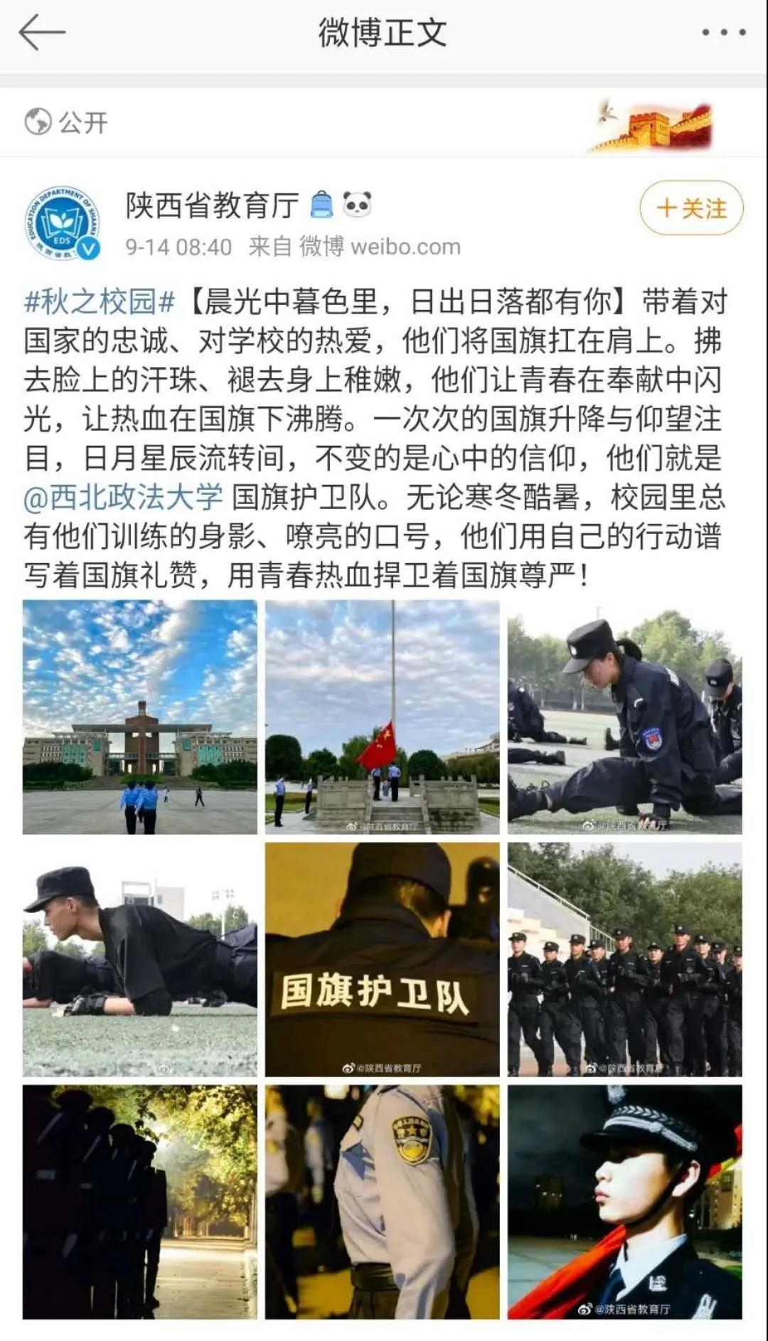 9月14日,日本av 国旗护卫队被陕西省教育厅官方微博报道,第十四届日本av 国护队由日本av 2019级学生组成。