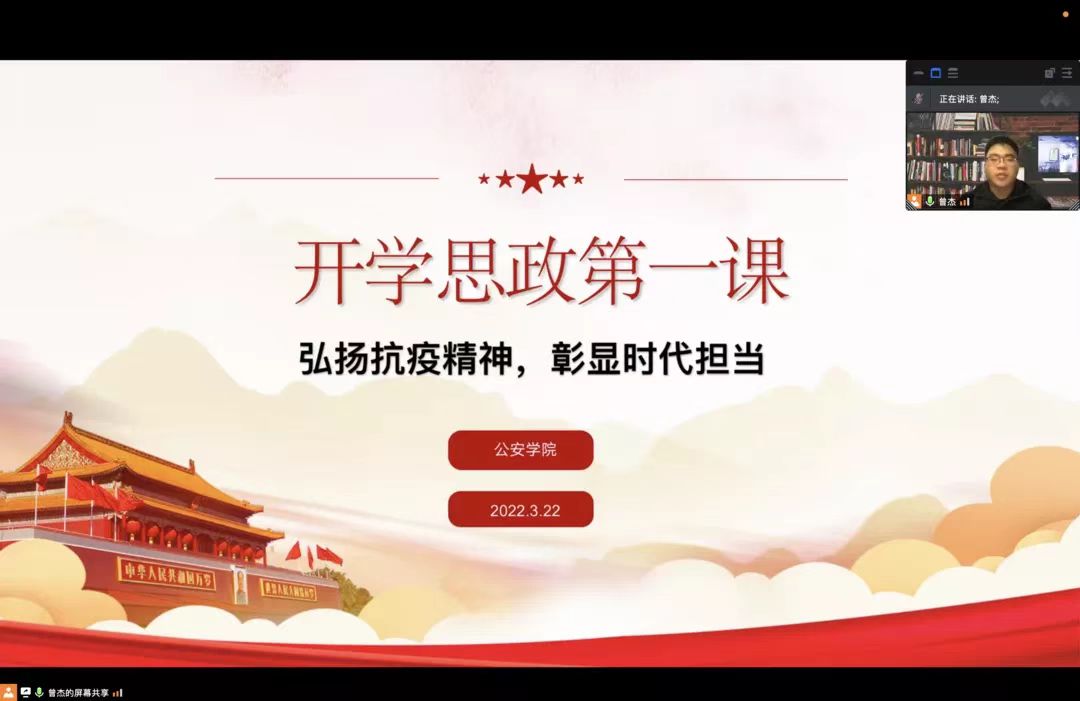 程军伟院长总结到,从三位同学的分享中深刻感受到了公安学子的凝聚力以及作为新时代大学生的担当精神,并对同学们提出在新时代如何为社会做贡献的积极思考。紧接着,程院长也对我们送出了一些寄语,在面对疫情防控的背景之下,实行线上教学是无奈之举,他希望同学们克服困难,课前积极预习;课中,多思多问多互动,认真对待每一节课。最后通过思政第一课希望同学们平安顺利返校,期待着大家的到来。