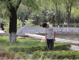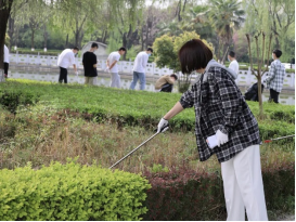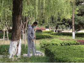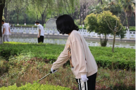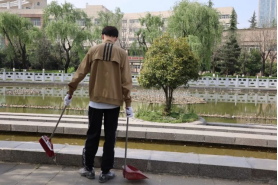 在分配完清洁工具后,同学们有序到达指定卫生区域,开始对卫生责任区域内杂物、垃圾、烟头进行清理,同时对区域内指示牌进行擦拭清洁,并对歪斜的指示牌扶正重新固定。同学们戴着口罩,做好防护,利用清洁工具捡拾落叶、杂草、草坪中的垃圾,在池塘周围的同学们利用垃圾钳捡拾漂浮在水面的塑料和漂浮物,同学们对于石桌、石凳、广告牌仔细擦拭并且铲除地面的贴纸与垃圾。大家团结协作,认真打扫,每一处垃圾都不放过,经过合理高效的分工协作,学院卫生责任区域的道路、草坪、池塘一尘不染。