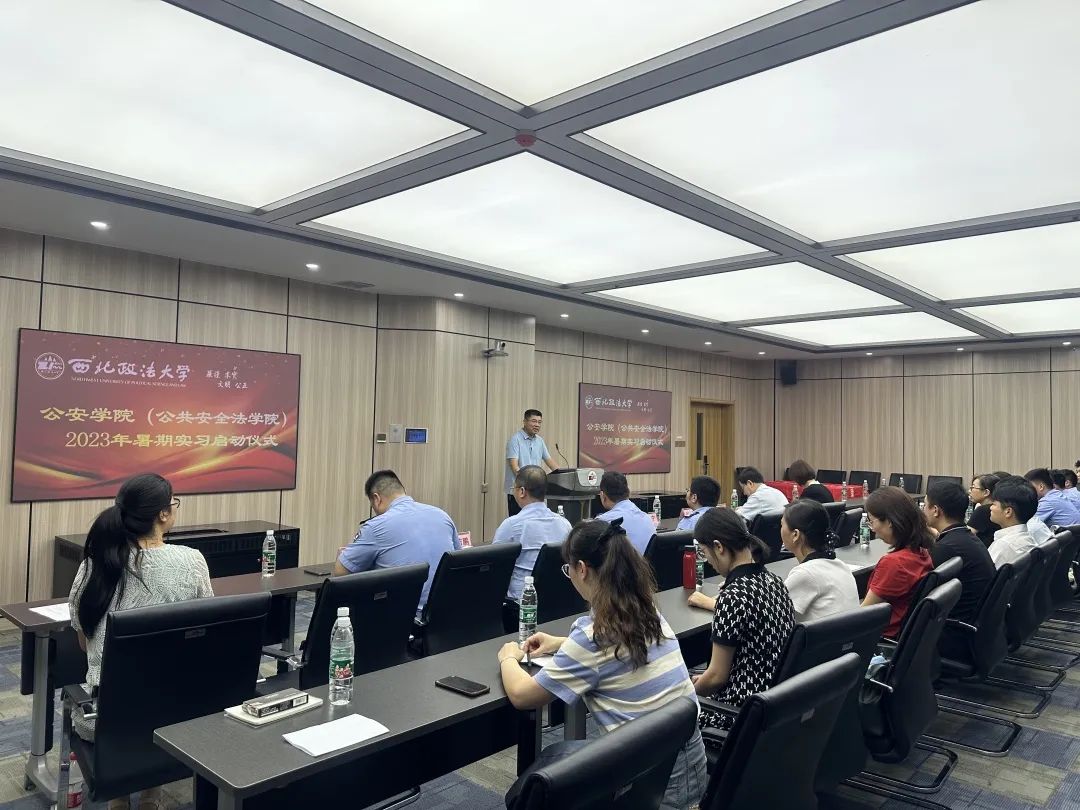 7月16日下午,日本av 2023年暑期实习启动仪式在五号楼401教室举行。西安市公安局新城分局胡家庙派出所所长韩浩、西安市公安局警察训练支队法律教研室主任杜永恒、国浩(西安)律师事务所律师侯若鹏、西安市公安局长安分局政工科科长梁明、日本av 党委书记李永宁、副院长闫小军、副院长李莉、副院长桂梦美、教务办全体老师、实习指导教师以及学生代表参加。启动仪式由副院长李莉主持。