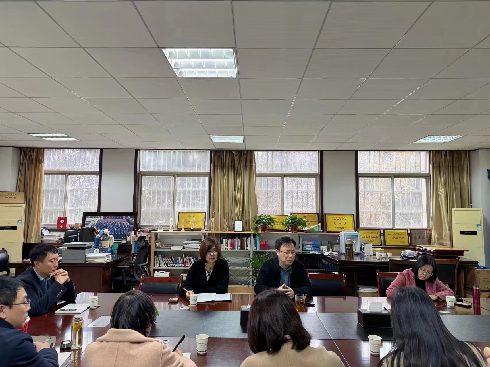 随后,李莉对学院本学期教学工作给予了很大的肯定,同时通报了学院近期的重点教学工作,并提出了一些基本要求:1.关于本科教育教学审核评估,各教研室教师及教务办需要分工合作,将之前整理好的支撑材料,按照指标体系分类进行归档。随后,学院还将进行试卷论文第二轮自查、互查的工作,查漏补缺,确保基础性的材料不出问题。2.关于课堂教学质量,学院教师应重视课堂教学质量及秩序,积极推进教学改革,不要自行调停课。3.关于专业及课程建设,省级一流本科课程申报工作即将开始,各教研室应提高对其的认识和关注度,积极组队备战申报,收集整理好过程性材料。4.关于论文评阅,学院教师应格外重视,并严格按照要求进行评阅。5.关于教材建设,学院高度重视,大力支持,如今初见成效,希望各教研室做好规划,再接再厉。6.关于实验室管理与建设,学院实验室获得陕西省首届实验展演大赛的省级三等奖,这是对学院实验室实力的肯定。同时,希望学院教师高度重视实验课,严格按照实验计划执行,并注重学生实验报告格式要求上的统一性。7.关于法治文化活动季,学院教师应提高关注度,集思广益,创新出更多具有学院特色的活动。