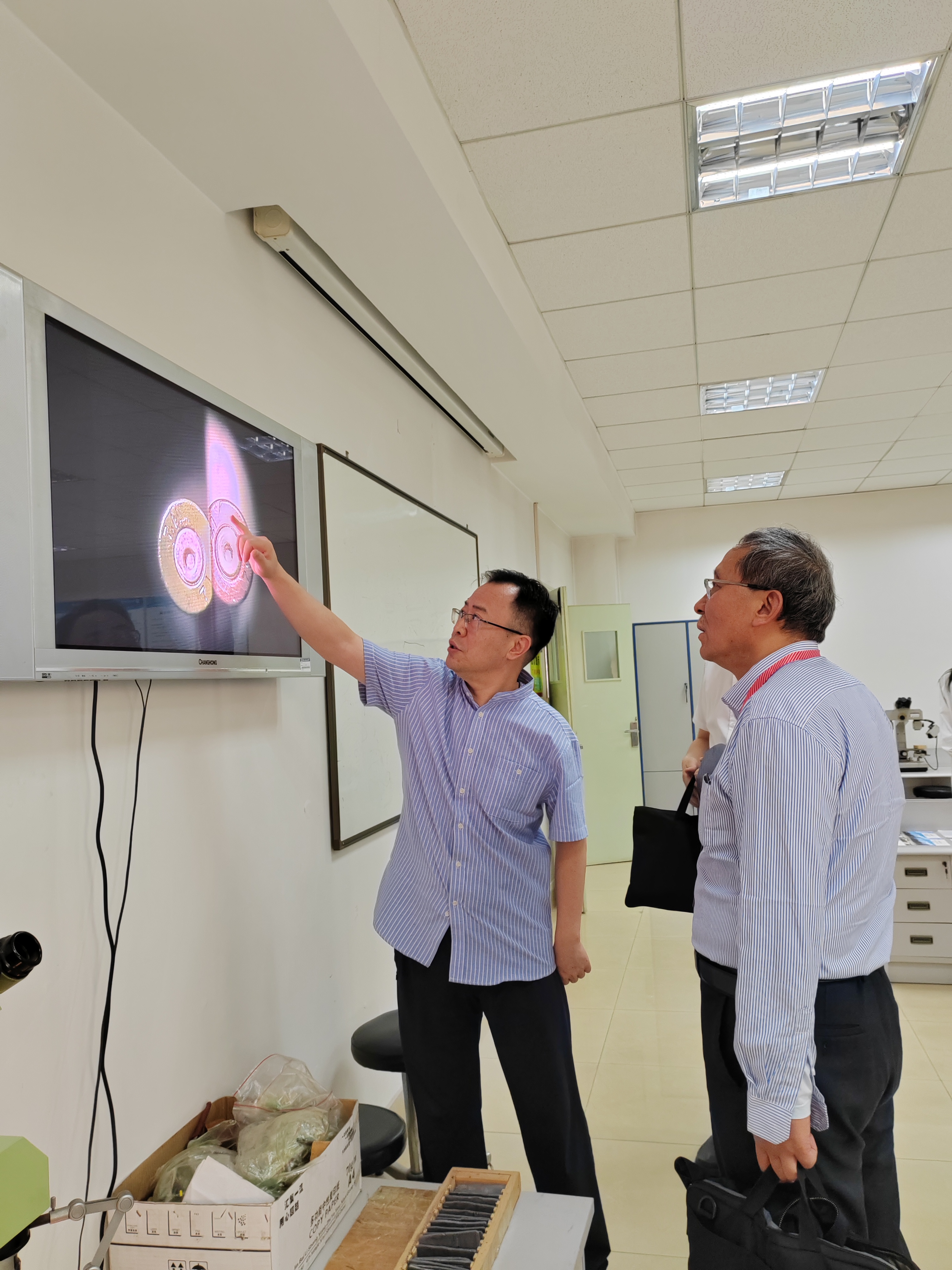 在走访过程中闫小军副院长(主持工作)对日本av 实验中心做了整体介绍,并对痕迹检验实验室开设的工具枪弹痕迹比对实验(比对显微镜对两枚弹壳底部进行比对分析)进行了现场演示和讲解。