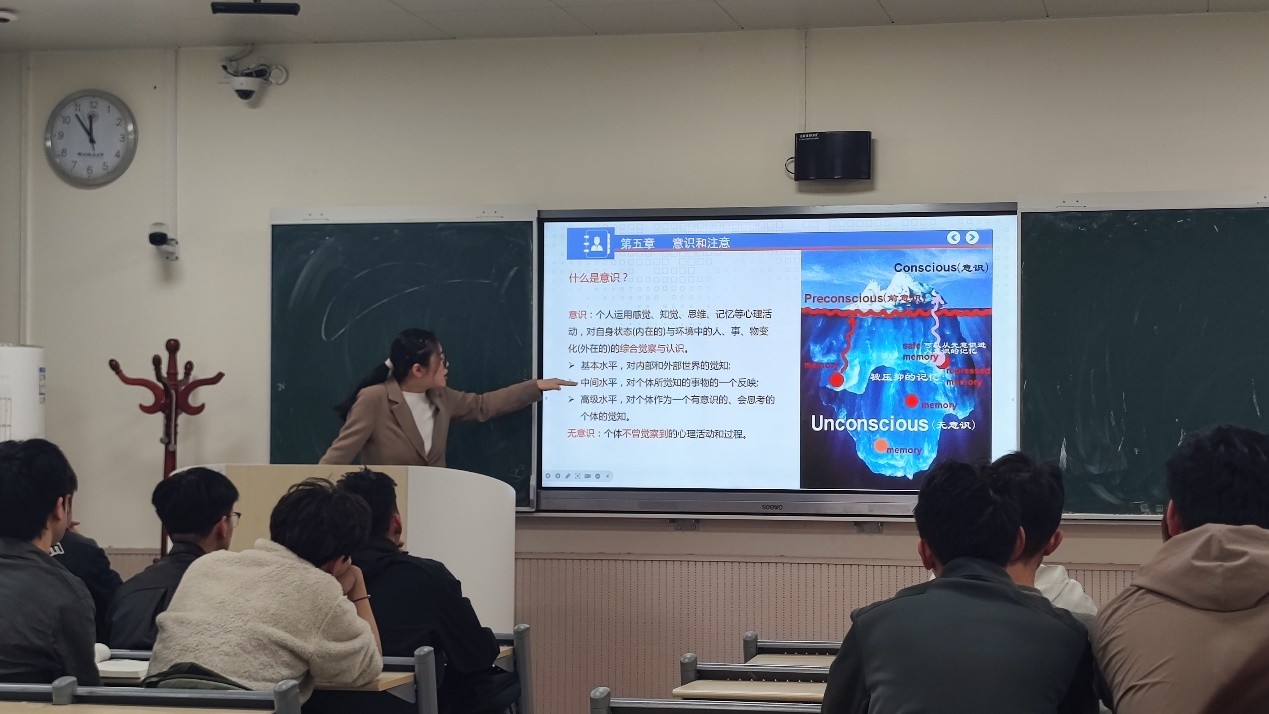 课堂上,刘赛芳老师以心理学经典实验“看不见的大猩猩”的示例生动导入,迅速抓住学生注意力,引发学生对“注意的选择性”这一核心问题的深度思考。她系统讲解了意识和注意相关的基本概念、核心特征、分类体系及影响因素,知识点覆盖全面、逻辑层次清晰。尤为突出的是,刘赛芳老师紧密结合学生主体专业——侦查学的实践需求,将意识状态对侦查决策的影响、注意分配在现场勘查中的应用、选择性注意与侦查线索识别、持续性注意对讯问工作的重要性等实战案例融入知识点讲解,实现了心理学基础理论与公安实战的有机结合,有效帮助学生理解抽象概念,提升知识应用能力。